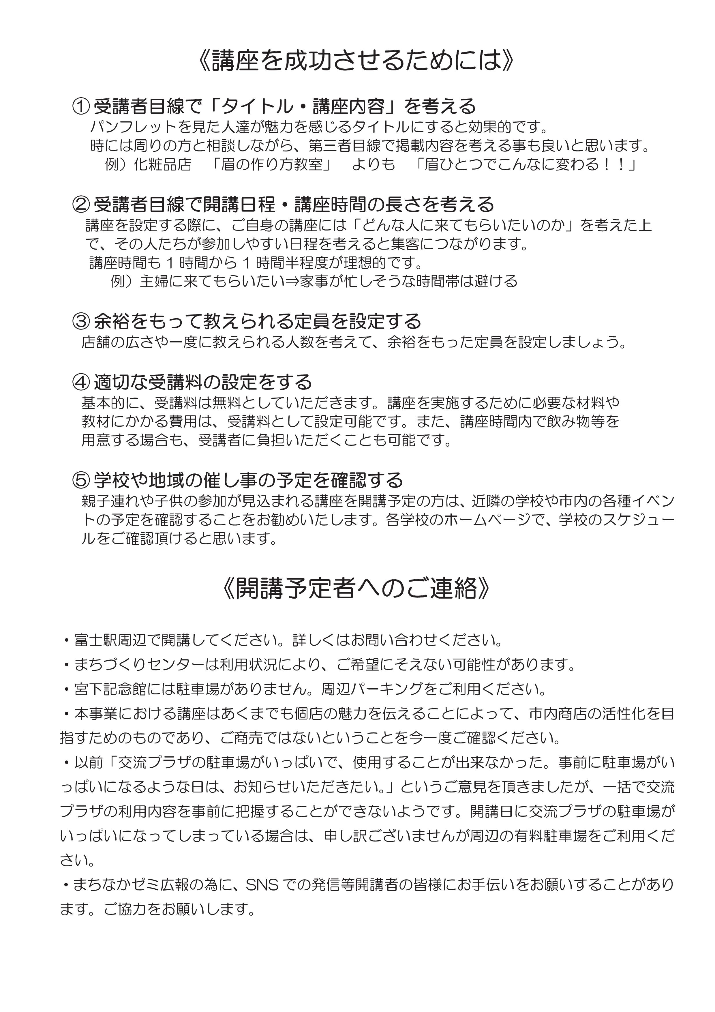 2019.07.08 商業観光課まちなかゼミ案内・申込書(HP用)-004富士商工会議所 総務部 総務課〒417-0057 静岡県富士市瓜島町82番地 TEL 0545-52-0995 FAX 0545-52-9796 MAIL somu@fuji-cci.or.jp