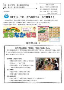 2024.01.09 商業観光課まちなかゼミ案内(簡易版)富士商工会議所 中小企業相談所 経営相談課〒417-0057 静岡県富士市瓜島町82番地 TEL 0545-52-0995 FAX 0545-52-9796 MAIL keiei@fuji-cci.or.jp