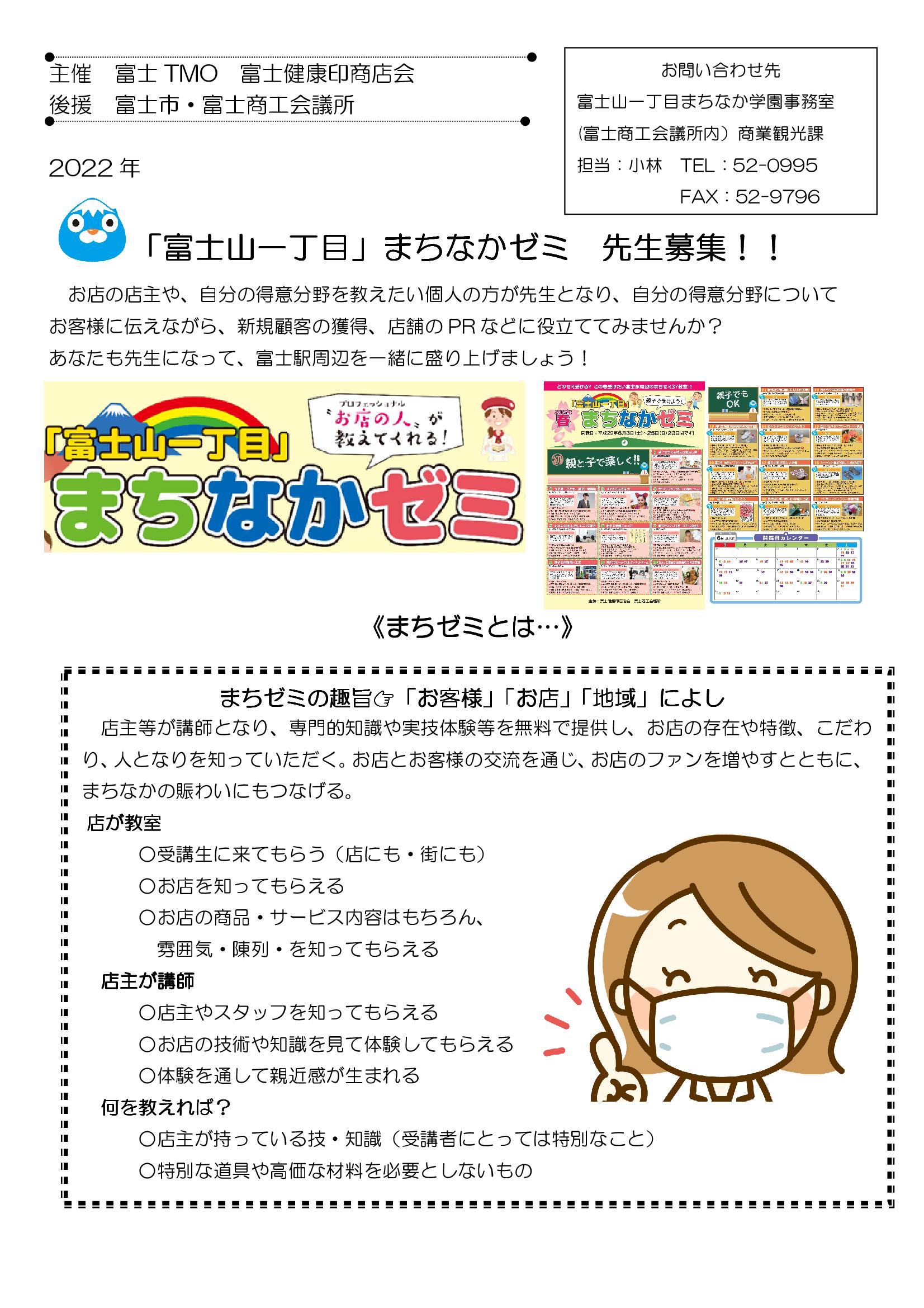 2022.01.21 商業観光課まちなかゼミ案内(HP用)-01富士商工会議所 総務部 振興課〒417-0057 静岡県富士市瓜島町82番地 TEL 0545-52-0995 FAX 0545-52-9796