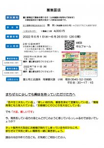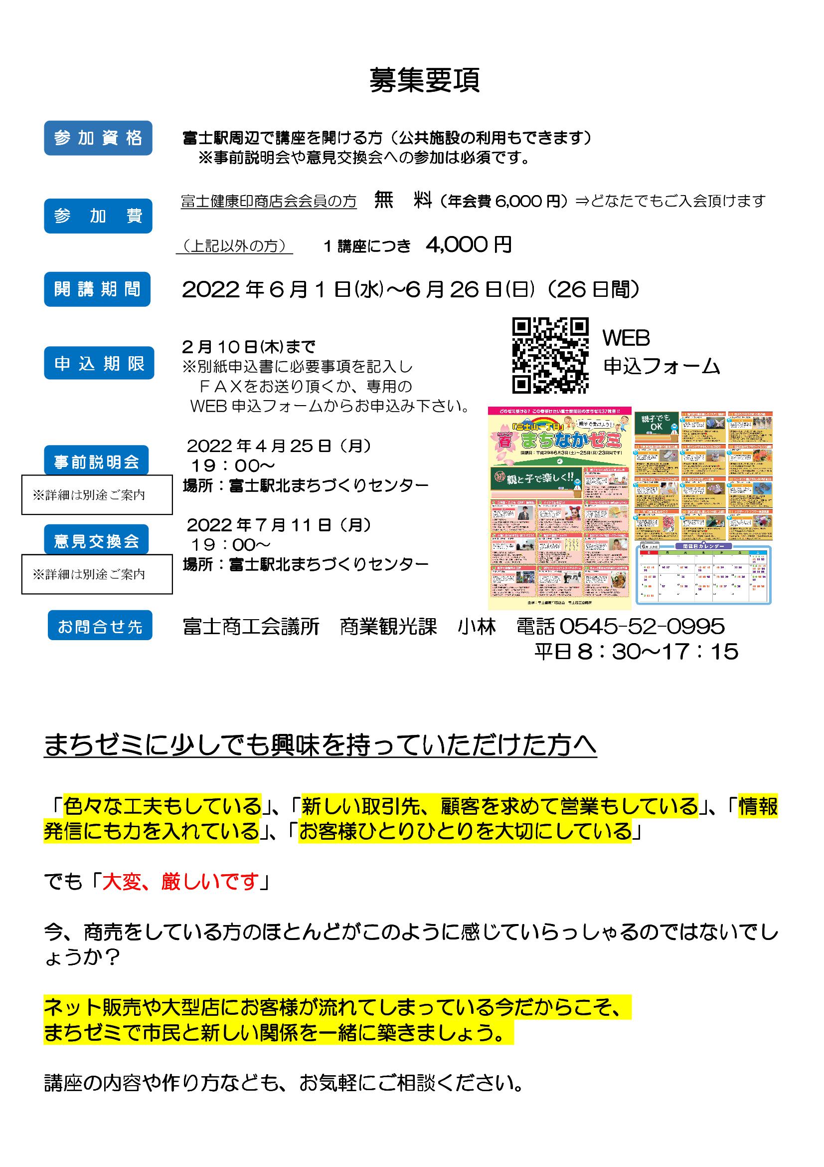 2022.01.21 商業観光課まちなかゼミ案内(HP用)-04富士商工会議所 ジョブ・カードサポートセンター〒417-0057 静岡県富士市瓜島町82番地 TEL 0545-52-0995 FAX 0545-52-9796 MAIL job@fuji-cci.or.jp