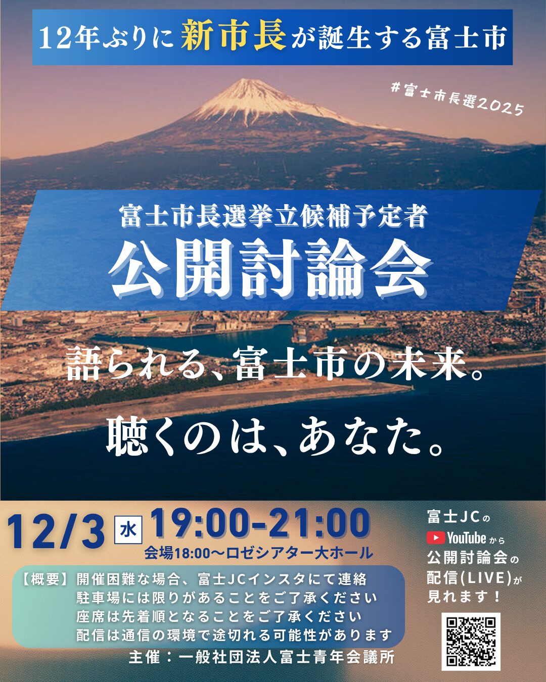 2025.11.25 総務部総務課公開討論会富士商工会議所 総務部 総務課〒417-0057 静岡県富士市瓜島町82番地 TEL 0545-52-0995 FAX 0545-52-9796 MAIL somu@fuji-cci.or.jp