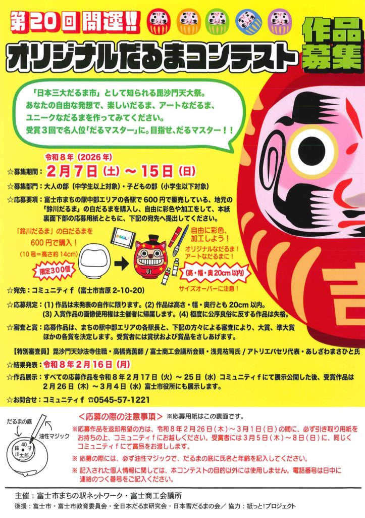 富士市まちの駅中部エリアの各駅で600円で販売している、地元の「鈴川だるま」の白だるまを購入し、自由に色彩や加工をして、応募用紙とともにコミュニティf(富士市吉原2-10-20)へ提出してください。