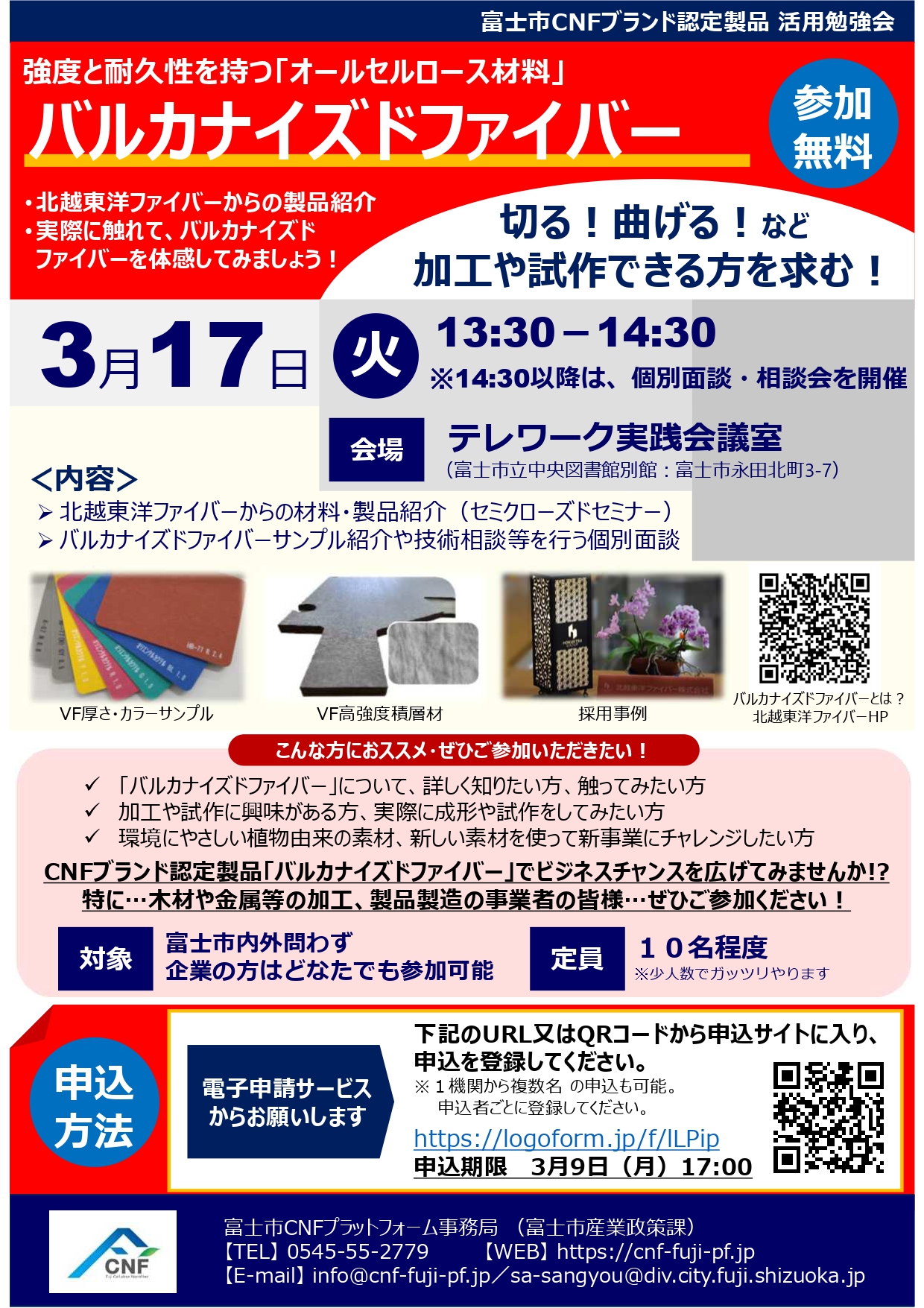 富士市では、2021年8月に富士市CNFブランド認定制度を創設し、2025年2月に第6期として認定した北越東洋ファイバー社製「バルカナイズドファイバー」について、この製品を活用した試作や成形・加工等に興味がある企業を募集し、用途開発に向けた勉強会を開催します。