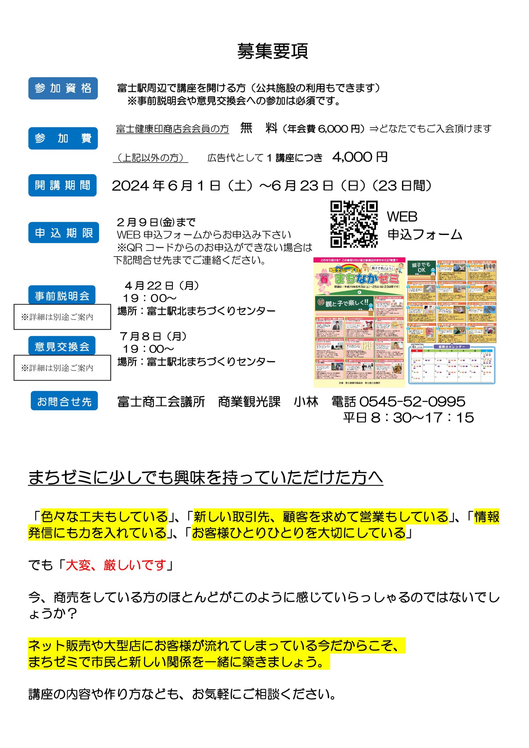 2024.01.11 商業観光課Microsoft Word – まちなかゼミ案内(簡易版)-04富士商工会議所 総務部 振興課 共済係富士商工会議所 振興事業部 振興課 共済係 TEL 0545-52-0995 FAX 0545-52-9796